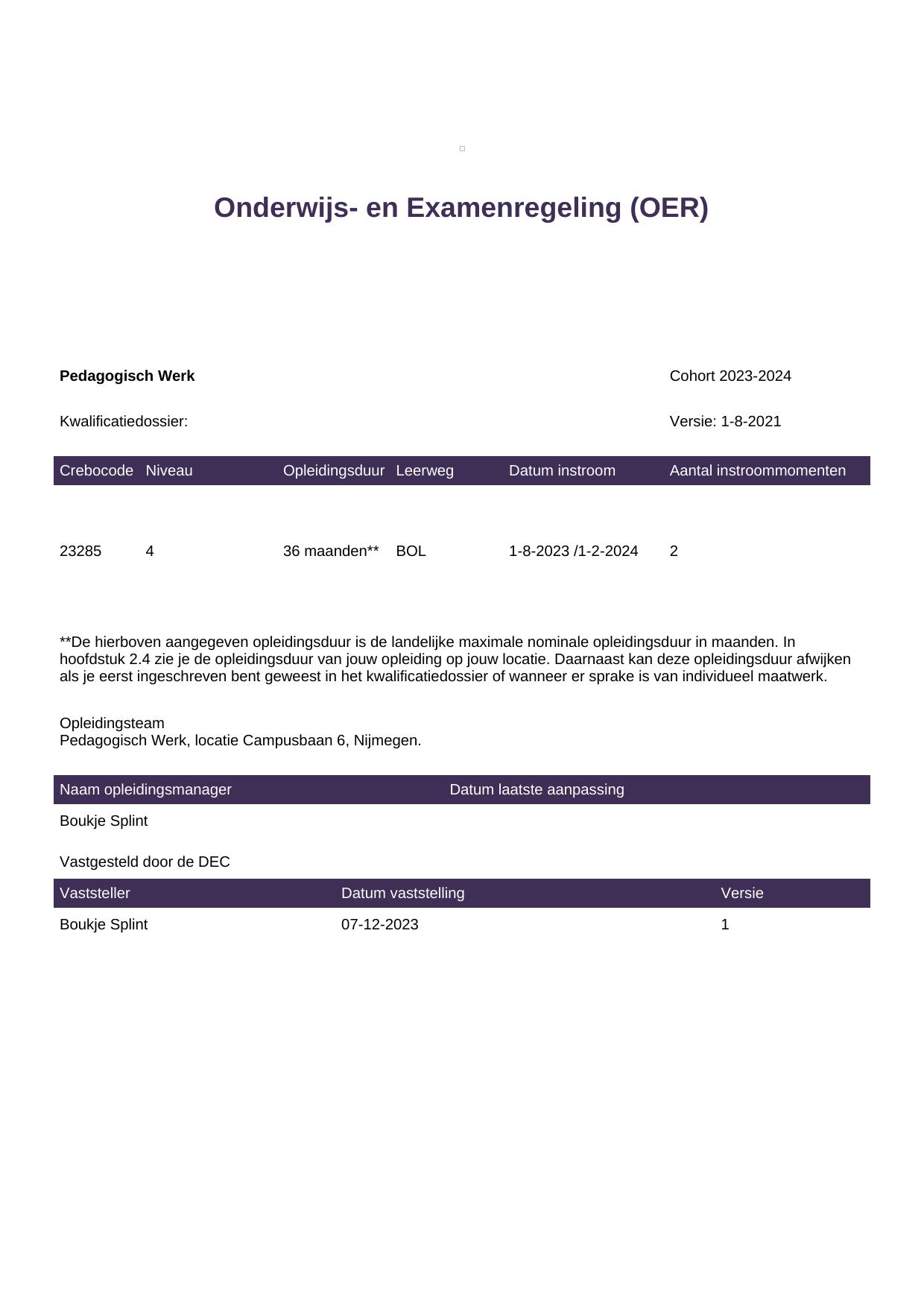 Pedagogisch Werk 23285BOL-NYM in cohort 2023-2024
