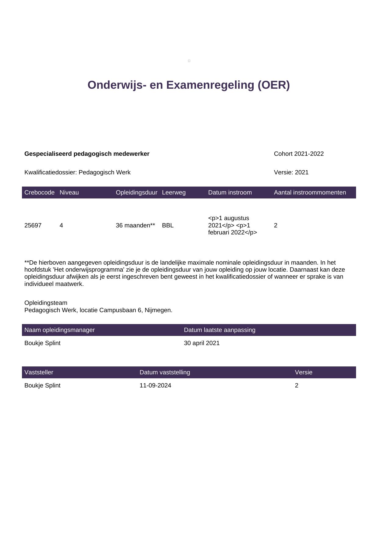Gespecialiseerd pedagogisch medewerker 25697BBL-NYM in cohort 2021-2022